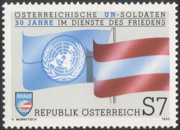 More InformationAustria 1990 Austrian Participation in UN Peacekeeping Forces 30th Anniversary 1 value featuring United Nations and Austrian National Flags - in superb u/m (mnh) condition. Excellent country, military, army, soldiers, uniform, badges, emblem, flag thematics. If you cannot find the specific stamp set or thematic/topic you are looking for either here in my shop or at the brumstamp stamp shop on eBay http://stores.shop.ebay.co.uk/The-Brumstamp-Stamp-Shop please do not hesitate to contact me. Enjoy browsing and shopping. Andrea!