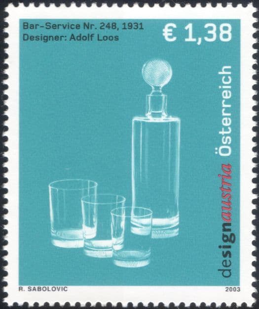 More InformationAustria 2003 "Design Austria" (design group) (3rd issue) 1 value featuring "Bar-Service (Carafe and Glasses) Nr 248 (1931)" (Adolf Loos) - in superb u/m (mnh) condition - excellent country, designers, people, art, craft thematics. If you cannot find the specific stamp set or thematic/topic you are looking for either here in my shop or at the brumstamp stamp shop on eBay http://stores.shop.ebay.co.uk/The-Brumstamp-Stamp-Shop please do not hesitate to contact me. Enjoy browsing and shopping. Andrea!