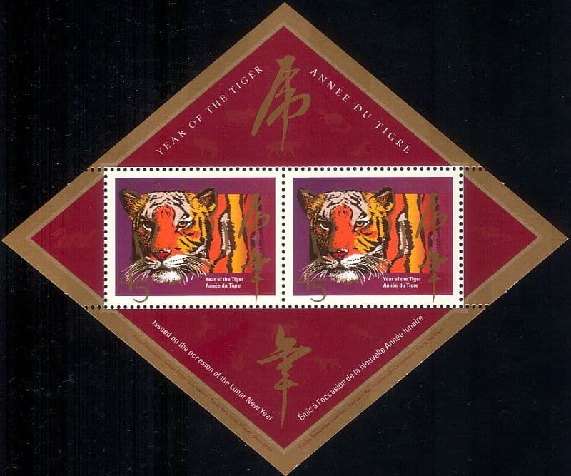 More InformationCanada 1998 Year of the Tiger 2 x 1 value miniature sheet - with PRINTERS IMPRINT as overprint in gold margin - depicting Tiger - in superb u/m (mnh) condition - excellent country, nature, animals, wild cats, tigers, feline, greetings thematics. If you cannot find the specific stamp set or thematic/topic you are looking for either here in my shop or at the brumstamp stamp shop on eBay http://stores.shop.ebay.co.uk/The-Brumstamp-Stamp-Shop please do not hesitate to contact me. Enjoy browsing and shopping. Andrea!