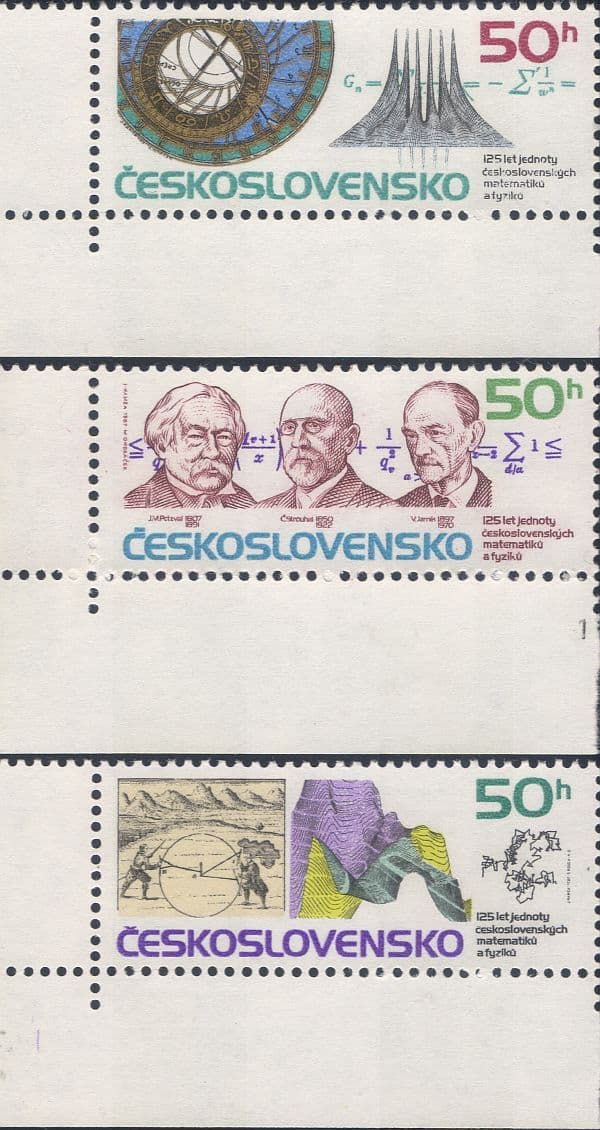 More InformationCzechoslovakia 1987 Union of Czech Mathematicians and Scientists 125th Anniversary 3 value featuring Portraits J M Petzval, C Strouhal and V Iarnik; Prague Town Hall Clock and Theory of Motion Diagram; Brownian Motion and Earth Fold Diagram - in superb u/m (mnh) condition. Excellent country, people, science, maths, mathematics, algebra, history thematics. If you cannot find the specific stamp set or thematic/topic you are looking for either here in my shop or at the brumstamp stamp shop on eBay http://stores.shop.ebay.co.uk/The-Brumstamp-Stamp-Shop please do not hesitate to contact me. Enjoy browsing and shopping. Andrea!