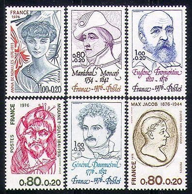 More InformationFrance 1976 Red Cross Fund : Celebrities 6 value set depicting Marshall Moncey, General Daumesnil, Anna de Noailles, Max Jacob (Poet), Eugene Fromentin (Writer) and Mounet-Sully (Tragedian) - in superb u / m (mnh) condition - excellent country, red cross, health, medical, writers, authors, literature, books, military, people, animation thematics . If you cannot find the specific stamp set or thematic/topic you are looking for either here in my shop or at the brumstamp stamp shop on eBay http://stores.shop.ebay.co.uk/The-Brumstamp-Stamp-Shop please do nothesitate to contact me. Enjoy browsing and shopping. Andrea!