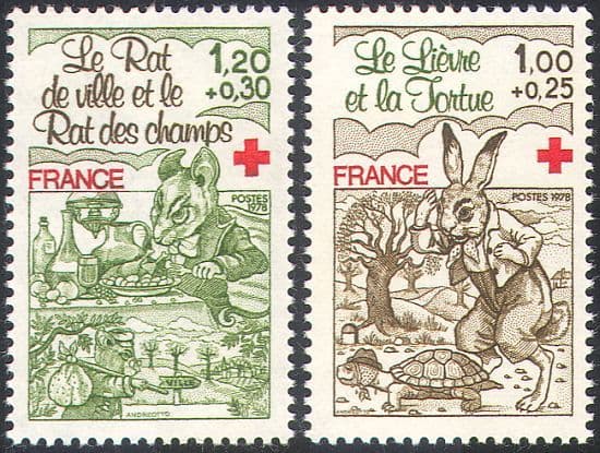 More InformationFrance 1978 Red Cross 2 value set featuring "The Hare and the Tortoise" and "The Town Mouse and the Country Mouse" (Fables of La Fontaine) - in superb u / m (mnh) condition. Excellent country, health, medical, nursing, red cross, red crescent, organisations, animals, nature, rodents, folk tales, stories, literature, books, art, animation thematics. If you cannot find the specific stamp set or thematic/topic you are looking for either here in my shop or at the brumstamp stamp shop on eBay http://stores.shop.ebay.co.uk/The-Brumstamp-Stamp-Shop please do not hesitate to contact me. Enjoy browsing and shopping. Andrea!