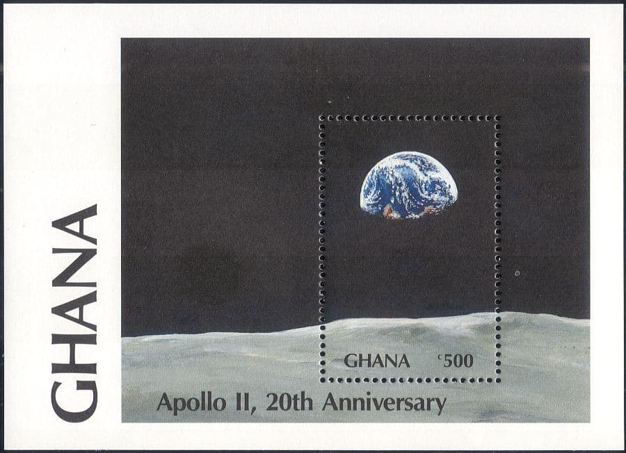 More InformationGhana 1989 Apollo 11 Moon Landing 20th Anniversary 1 value miniature sheet featuring Photograph of the Earth from Surface of the Moon - in superb u/m (mnh) condition - excellent country, space, apollo, rockets, transport, astronauts, science thematics. If you cannot find the specific stamp set or thematic/topic you are looking for either here in my shop or at the brumstamp stamp shop on eBay http://stores.shop.ebay.co.uk/The-Brumstamp-Stamp-Shop please do not hesitate to contact me. Enjoy browsing and shopping. Andrea!