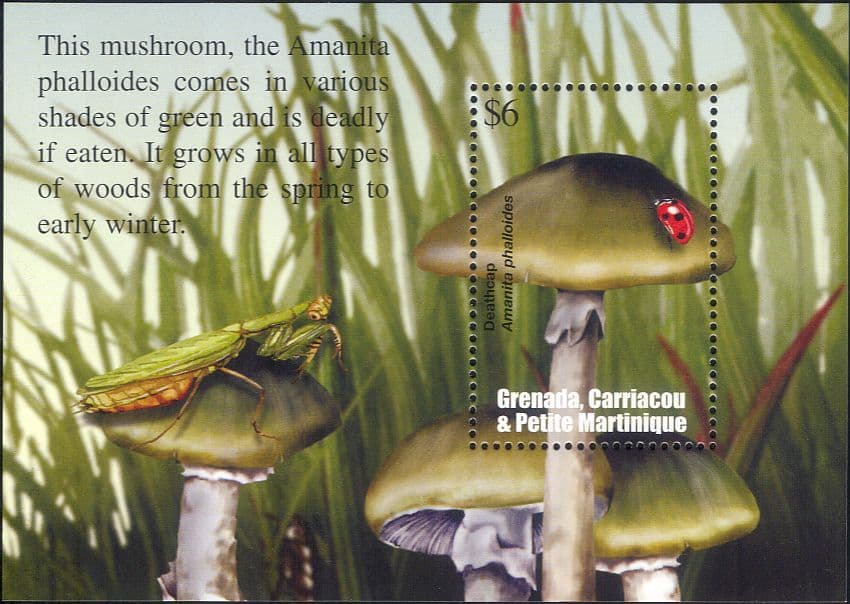 More InformationGrenadines of Grenada - Carriacou & Petite Martinique 2002 Flora & Fauna 1 value miniature sheet depicting Amanita phalloides (Deathcap Mushroom) with Ladybird, margin illustration includes Mushrooms and Grasshopper - in superb u/m (mnh) condition - excellent country, nature, insects, dragonflies, flowers, plants, conservation, animation thematics. If you cannot find the specific stamp set or thematic/topic you are looking for either here in my shop or at the brumstamp stamp shop on eBay http://stores.shop.ebay.co.uk/The-Brumstamp-Stamp-Shop please do not hesitate to contact me. Enjoy browsing and shopping. Andrea!