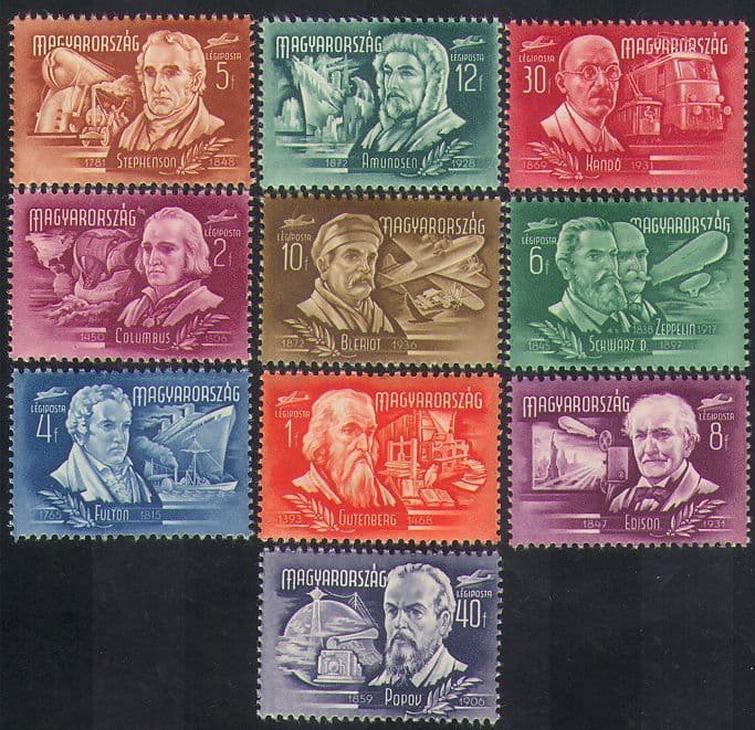 More InformationHungary 1948 Explorers and Inventors 10 value set depicting Christopher Columbus and " Santa Maria "; Roald Amundsen and Antarctica; George Stephenson and Steam Railway Engines; Kalman Kando and Electric Trolley Bus and Railway Locomotive; Johann Gutenberg and Printing Press, Louis Bleriot and Planes; Count von Zeppelin and Airship; Alexander Popov and Radio; Thomas Edison and Electric Light; Robert Fulton and Steam Ships - in superb u / m (mnh) condition. Excellent country, people, inventions, trains, rail, railways, locomotives, bus, buses, planes, aviation, transport, boats, antarctic, polar exploration, sailing, books, literature, communication, telecomms, animation thematics. If you cannot find the specific stamp set or thematic/topic you are looking for either here in my shop or at the brumstamp stamp shop on eBay http://stores.shop.ebay.co.uk/The-Brumstamp-Stamp-Shop please do not hesitate to contact me. Enjoy browsing and shopping. Andrea!