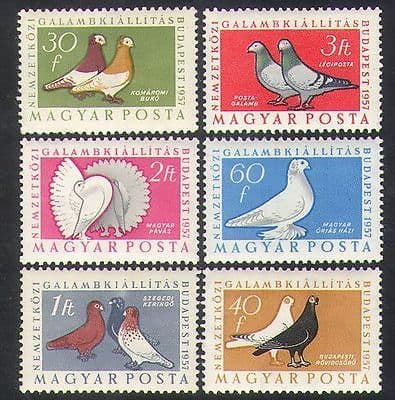 More InformationHungary 1957 International Pigeon Fanciers Exhibition, Budapest 6 value set including Carrier Pigeons, Fantailed Pigeon, Domestic Pigeon - in superb u / m (mnh) condition. Excellent country, birds, nature, wildlife, pigeon, racing, pets, pigeon fanciers, animation thematics. If you cannot find the specific stamp set or thematic/topic you are looking for either here in my shop or at the brumstamp stamp shop on eBay http://stores.shop.ebay.co.uk/The-Brumstamp-Stamp-Shop please do nothesitate to contact me. Enjoy browsing and shopping. Andrea!