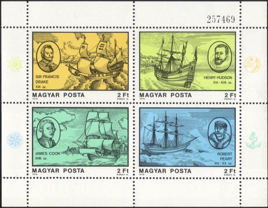 More InformationHungary 1978 Explorers and Navigators 4 value miniature sheet depicting "Golden Hind" (Sir Francis Drake), "Halve Maen" (Henry Hudson), HMS "Endeavour" (Captain James Cook) and Whaler (Robert Peary) - in superb u/m (mnh) condition - excellent country, ships, boats, sail, sailing, nautical, maritime, marine, transport, exploration, people thematics. If you cannot find the specific stamp set or thematic/topic you are looking for either here in my shop or at the brumstamp stamp shop on eBay http://stores.shop.ebay.co.uk/The-Brumstamp-Stamp-Shop please do not hesitate to contact me. Enjoy browsing and shopping. Andrea!