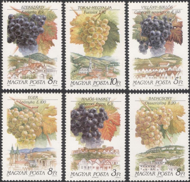 More InformationHungary 1990 Viticulture : Wine Grapes and Regions (1st issue) 6 value set featuring Leanyka Grapes and Eger Town Buildings; Cabernet Franc Grapes and Hajos Town Buildings; Cabernet Sauvignon Grapes and Villany Town Buildings; Reisling Grapes and Badacsony Town Buildings; Kadarka Grapes and Szekszard Town Buildings; Furmint Grapes and Tokaj-Hegyalja Town Buildings - in superb u/m (mnh) condition - excellent country, nature, plants, grapes, industry, business, commerce, food, drink, alcohol, heritage thematics. If you cannot find the specific stamp set or thematic/topic you are looking for either here in my shop or at the brumstamp stamp shop on eBay http://stores.shop.ebay.co.uk/The-Brumstamp-Stamp-Shop please do not hesitate to contact me. Enjoy browsing and shopping. Andrea!