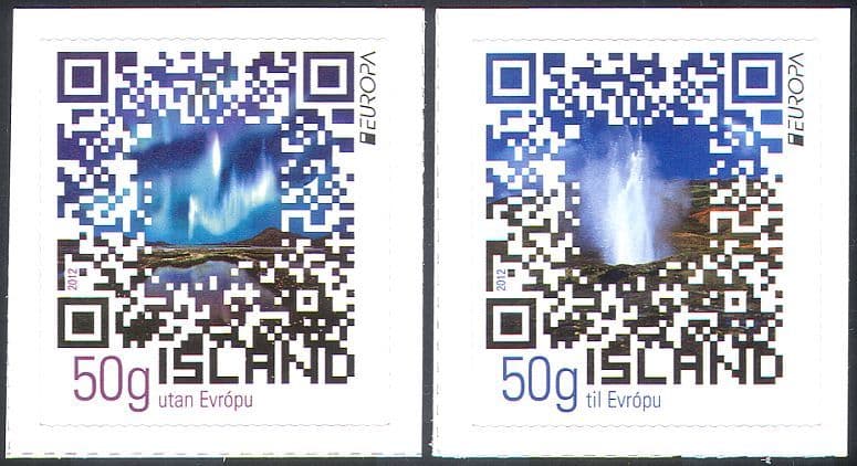 More InformationIceland 2012 Europa : "Visit Iceland" Tourism 2 value set (self adhesive, ex booklet) featuring Aurora Borealis (Northern Lights) and Geyser, both surrounded by Quick Response (QR) Code (scanning the code takes you to Iceland Postal Service) - in superb u/m (mnh) condition - excellent country, nature, water, mountains, holidays thematics. If you cannot find the specific stamp set or thematic/topic you are looking for either here in my shop or at the brumstamp stamp shop on eBay http://stores.shop.ebay.co.uk/The-Brumstamp-Stamp-Shop please do not hesitate to contact me. Enjoy browsing and shopping. Andrea!