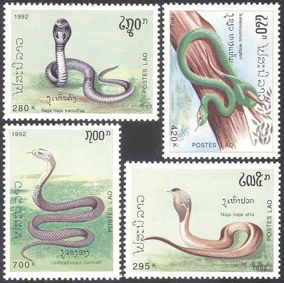 Laos 1992 King Cobra/ Common Cobra/ Wagler's Pit Viper/ Snakes/ Wildlife/ Reptiles 4v set (b449)