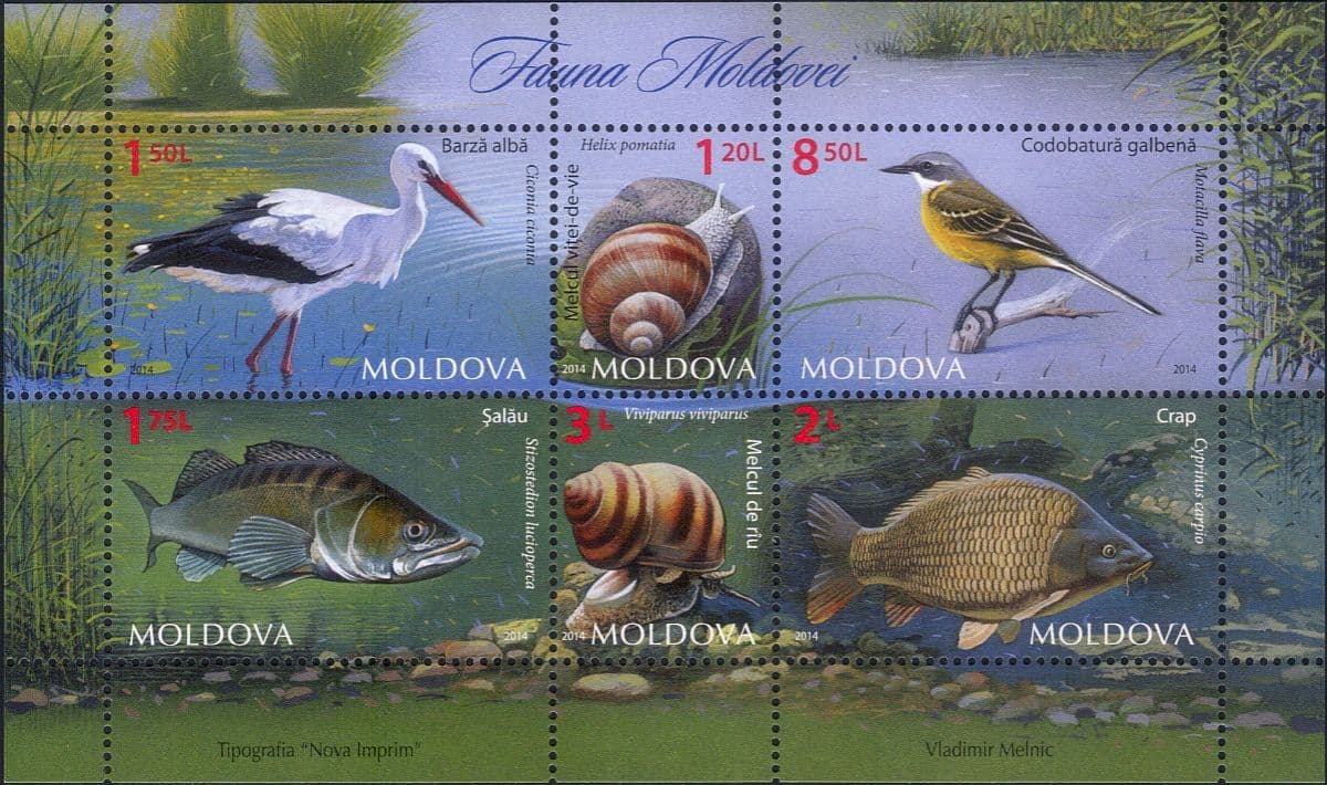 Moldova 2014 Stork/ Wagtail/ Zander/ Carp/ Birds/ Fish/ Snails/ Nature/ Wildlife 6v m/s (md1051)