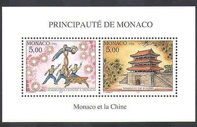 More InformationMonaco 1996 Monaco-Chinese Diplomatic Relations 2 value miniature sheet depicting Chinese Acrobatics Group and Fuling Tomb - in superb u / m (mnh) condition - excellent country, animation, entertainment, circus, acrobats, buildings, architecture, diplomacy, politics thematics . If you cannot find the specific stamp set or thematic/topic you are looking for either here in my shop or at the brumstamp stamp shop on eBay http://stores.shop.ebay.co.uk/The-Brumstamp-Stamp-Shop please do nothesitate to contact me. Enjoy browsing and shopping. Andrea!