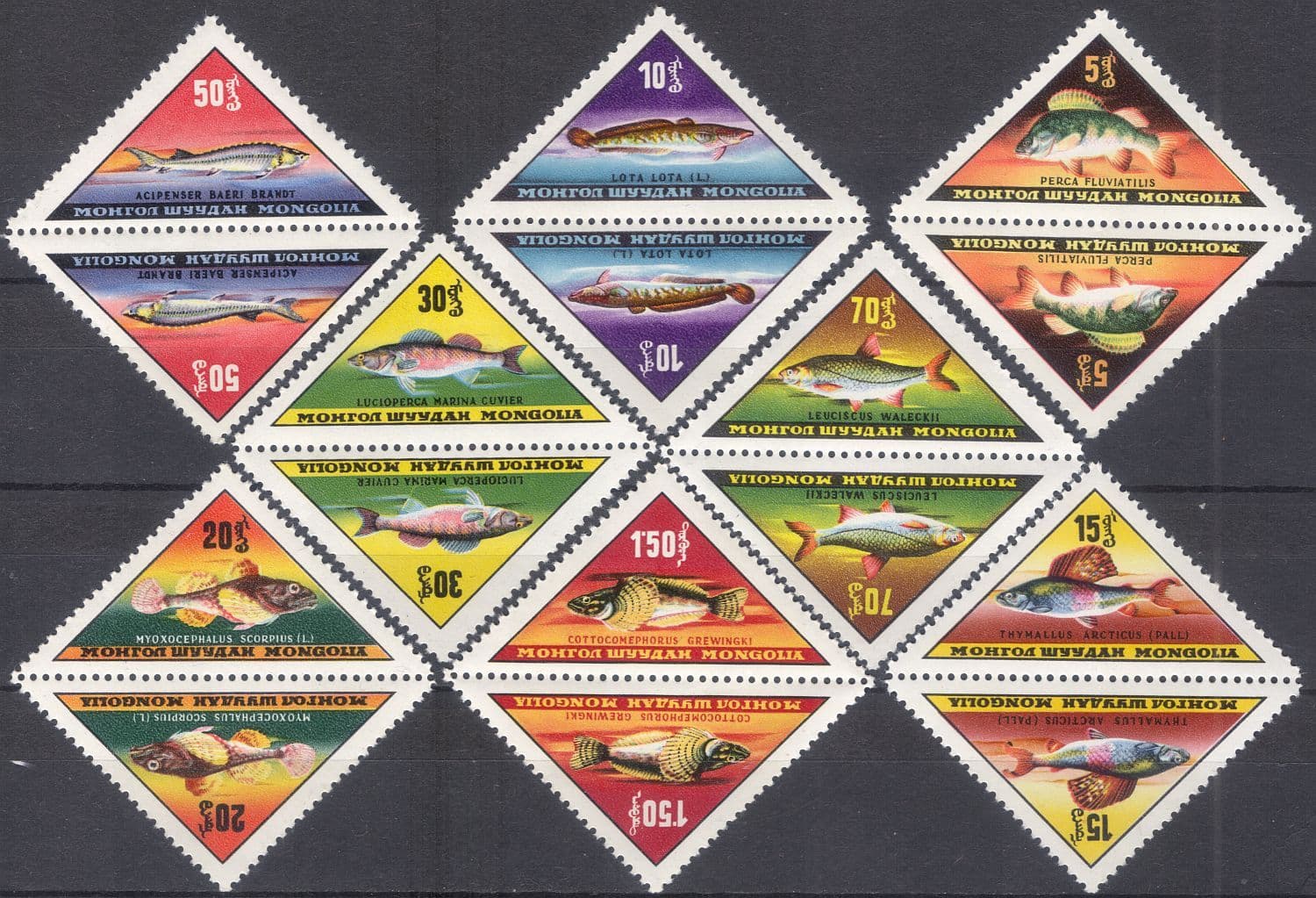 More InformationMongolia 1962 Freshwater and Marine Fish 8 value triangular set as TETE-BECHE PAIRS featuring Eurasian Perch, Burbot, Arctic Grayling, Short-spined Seascorpion, Estuarine Zander, Siberian Sturgeon, Waleck's Dace and Yellow-winged Bullhead - in superb u/m (mnh) condition - excellent fish, marine, nature, country, triangle thematics. If you cannot find the specific stamp set or thematic/topic you are looking for either here in my shop or at the brumstamp stamp shop on eBay http://stores.shop.ebay.co.uk/The-Brumstamp-Stamp-Shop please do not hesitate to contact me. Enjoy browsing and shopping. Andrea!