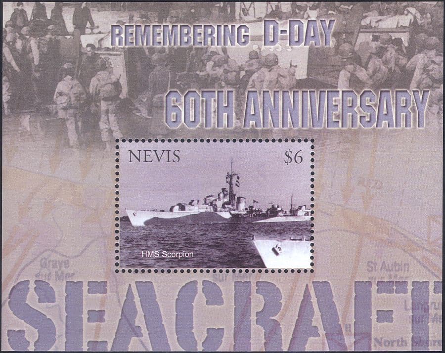 More InformationNevis 2004 D-Day Landings 60th Anniversary : Seacraft 1 value miniature sheet featuring HMS "Scorpion" - in superb u/m (mnh) condition - excellent country, military, people, navy, ships, boats, transport, second, World War 2, WWII, anniversaries thematics. If you cannot find the specific stamp set or thematic/topic you are looking for either here in my shop or at the brumstamp stamp shop on eBay http://stores.shop.ebay.co.uk/The-Brumstamp-Stamp-Shop please do not hesitate to contact me. Enjoy browsing and shopping. Andrea!