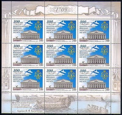 More InformationRussia 2009 Naval Museum 300th Anniversary 9 value sheet featuring Museum Building, Anchor and Flag - in superb u / m (mnh) condition - excellent country, buildings, architecture, navy, naval, ships, boats, nautical thematics.