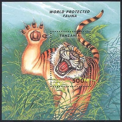 More InformationTanzania 1994 Endangered Species 1 value miniature sheet featuring Tiger ( Panthera t igris )- in superb u / m (mnh) condition - excellent country, wild cats, animals, nature, wildlife, conservation, environment thematics.