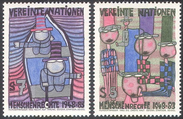 More InformationUnited Nations (Vienna) 1983 Declaration of Human Rights 35th Anniversary 2 value set featuring animated Paintings " Die Zweite Haut " and " Recht auf Traume " - in superb u / m (mnh) condition - excellent country, welfare, people, animation thematics. If you cannot find the specific stamp set or thematic/topic you are looking for either here in my shop or at the brumstamp stamp shop on eBay http://stores.shop.ebay.co.uk/The-Brumstamp-Stamp-Shop please do nothesitate to contact me. Enjoy browsing and shopping. Andrea!